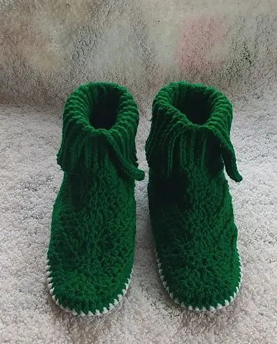 The crochet adult slipper boots pattern is quite an easy design. It starts at the sole with the sole worked in rows. It upper part of the crochet slipper is made and then the final part which is a long ribbed cuff is made, the seam is sewn doe to the sole with the long tail left from the ribbed cuff and you crochet boots is done!