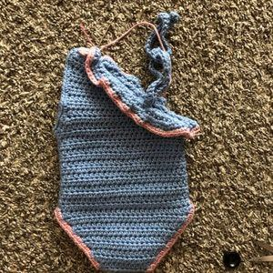 This crochet baby romper is a very simple, yet unique design. It is worked bottom up, with the front and back panels made separately. It has a mono strap design and a beautiful ruffle detailing. This crochet baby romper is super cute and great for the beach.