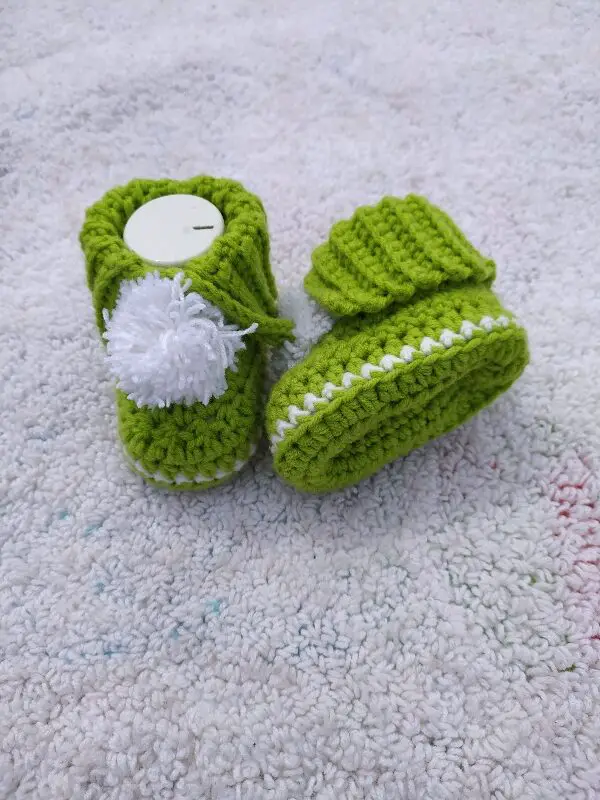 This crochet baby cuffed baby booties looks great in different colour combinations even in neutral colour. This crochet baby booties have a ribbed cuff detailing that gives your baby extra warmth and pompom embellishment makes it even cutier.