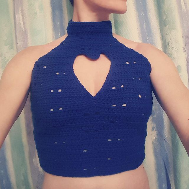 The crochet heart crop top pattern is worked bottom up, it has little eyelets that adds to its beauty, it shaped at the arm holes and has a heart shape cut out at the chest area that is made with short rows. It’s a halter top that is tied at the neck and at the back.