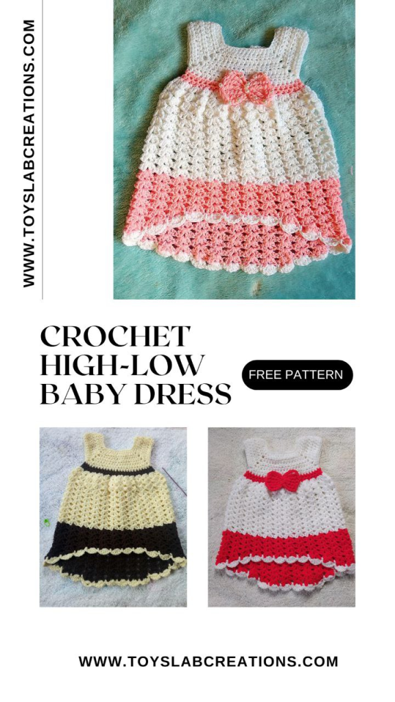 The crochet high-low baby dress has only one sizing option, The dress fits baby 0-12 months. This blog post contains instructions for.